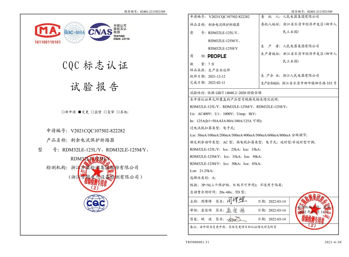 CQC試驗報告(202203):RDM32LE-125L,RDM32LE-125M,RDM32LE-125H剩余電流動作斷路器(點擊下載)