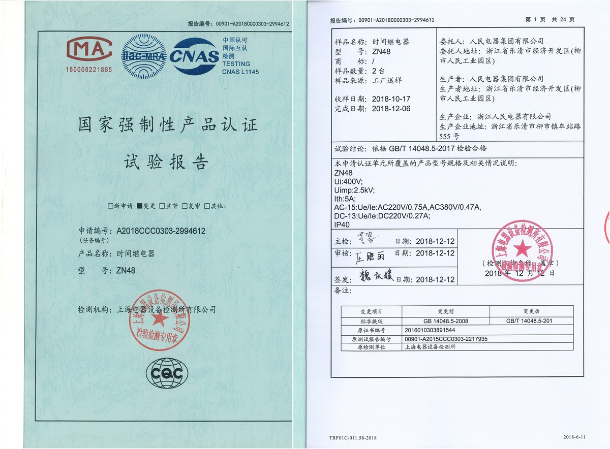 CCC試驗(yàn)報(bào)告(201812):ZN48時(shí)間繼電器(點(diǎn)擊下載)