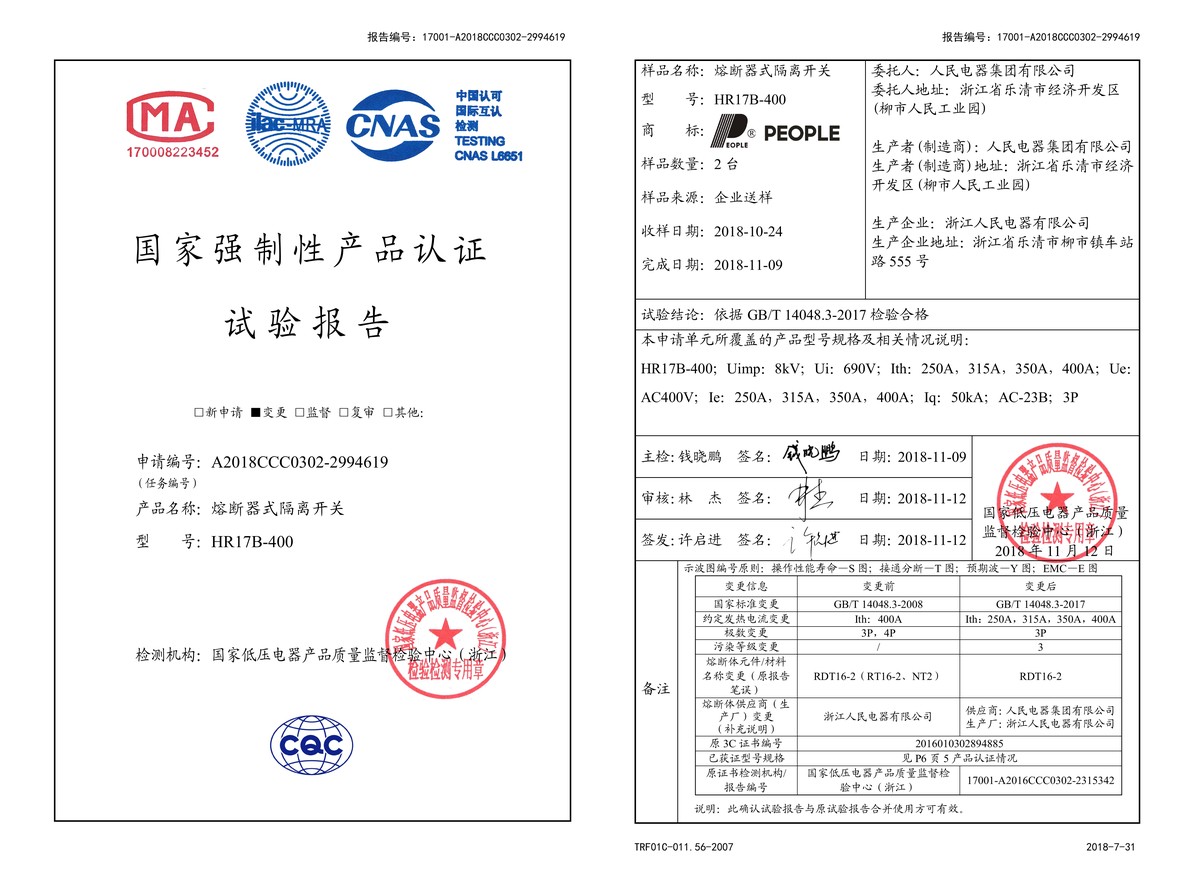CCC試驗(yàn)報(bào)告(201811):HR17B-400熔斷器式隔離開(kāi)關(guān)(點(diǎn)擊下載)