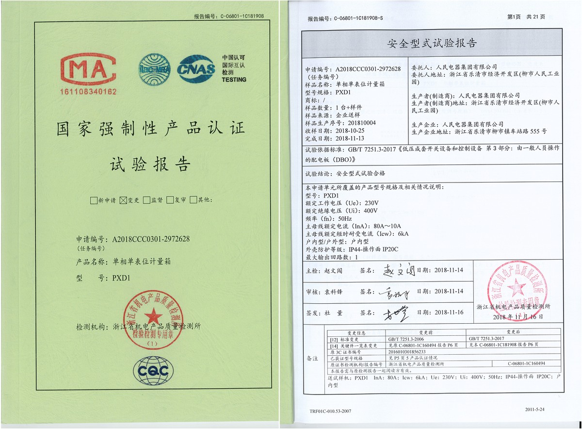 CCC試驗(yàn)報(bào)告(201811):PXD1單相單表位計(jì)量箱(點(diǎn)擊下載)