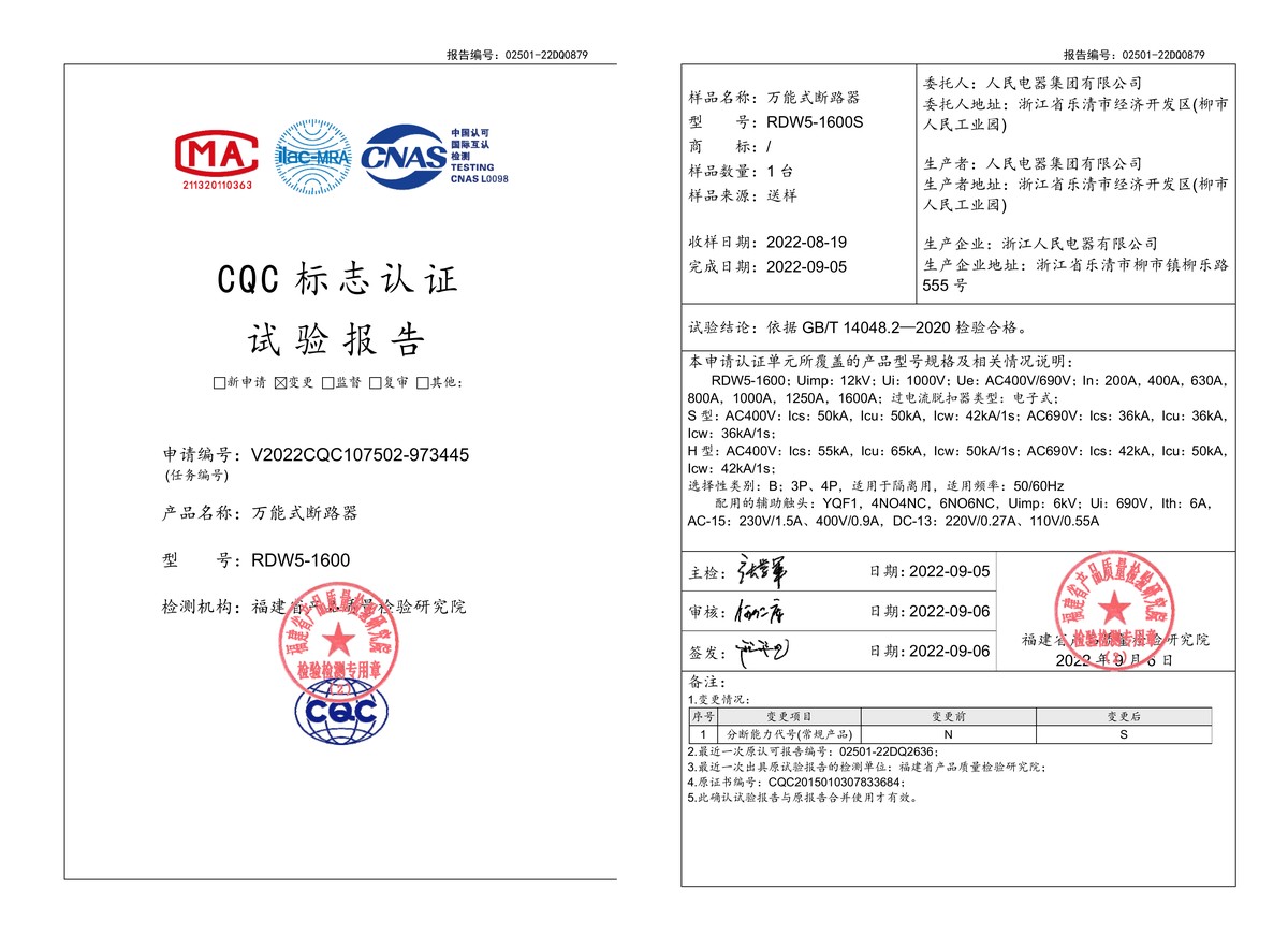 CQC試驗(yàn)報(bào)告(202209):RDW5-1600萬(wàn)能式斷路器(點(diǎn)擊下載)