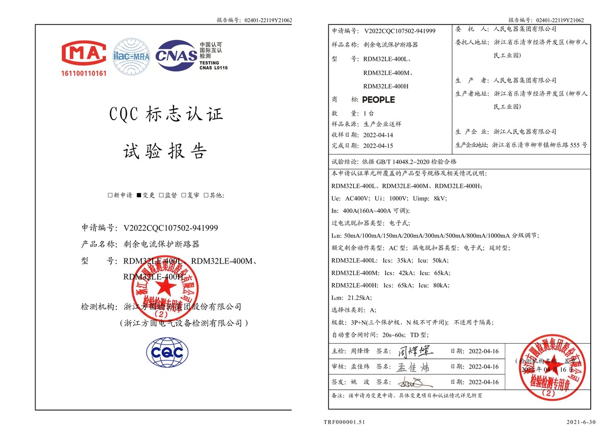 CQC試驗報告(202204):RDM32LE-400L,RDM32LE-400M,RDM32LE-400H剩余電流動作斷路器(點擊下載)