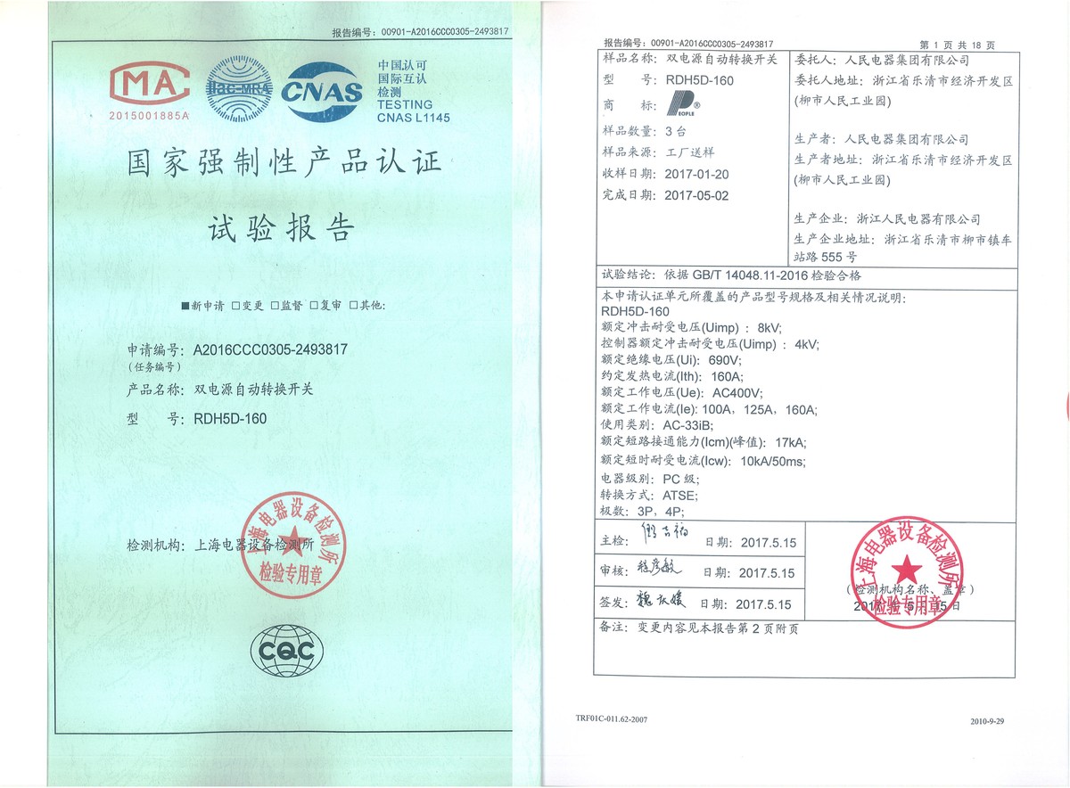 CCC試驗(yàn)報(bào)告(201705):RDH5D-160雙電源自動轉(zhuǎn)換開關(guān)(點(diǎn)擊下載)