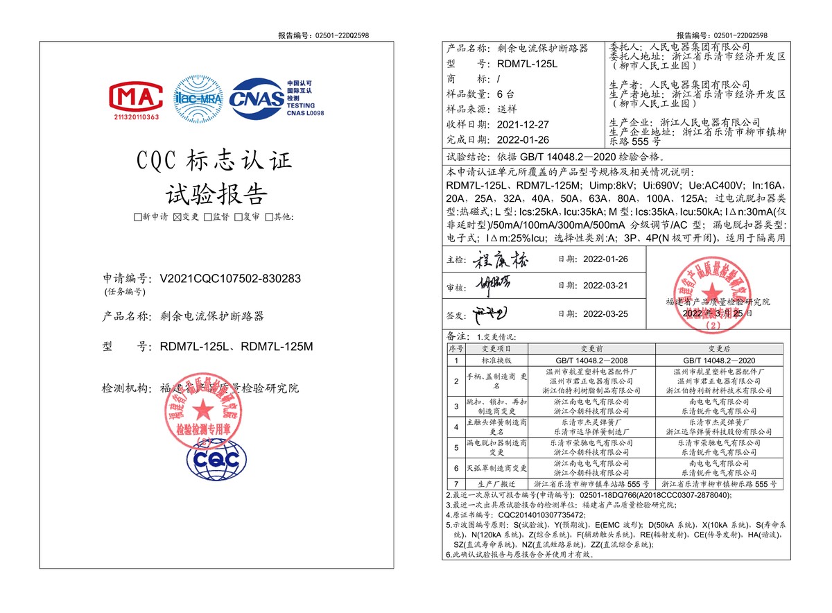 CQC試驗(yàn)報(bào)告(202203):RDM7L-125L,RDM7L-125M剩余電流保護(hù)斷路器(點(diǎn)擊下載)