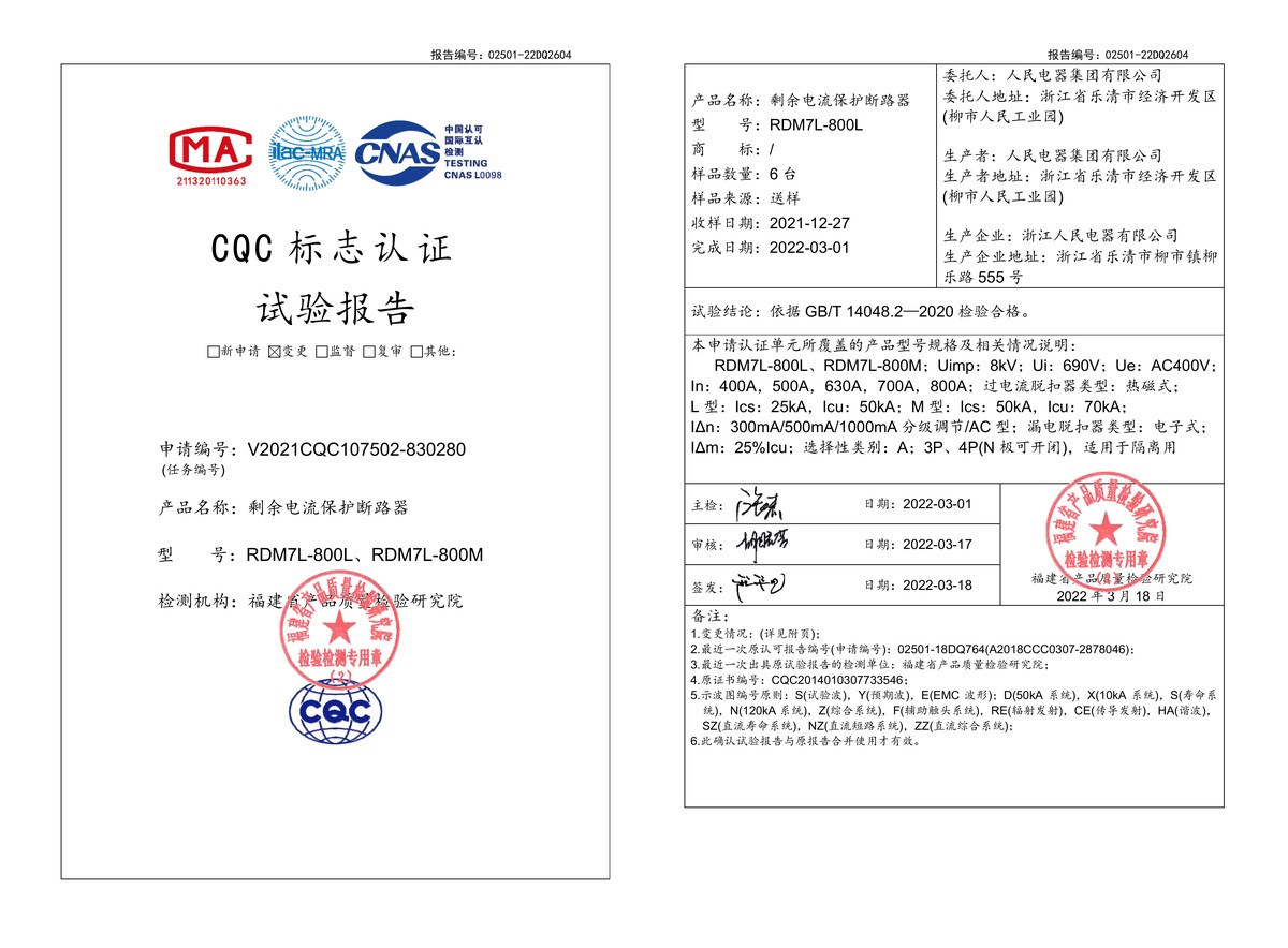 CQC試驗(yàn)報(bào)告(202203):RDM7L-800L,RDM7L-800M剩余電流保護(hù)斷路器(點(diǎn)擊下載)