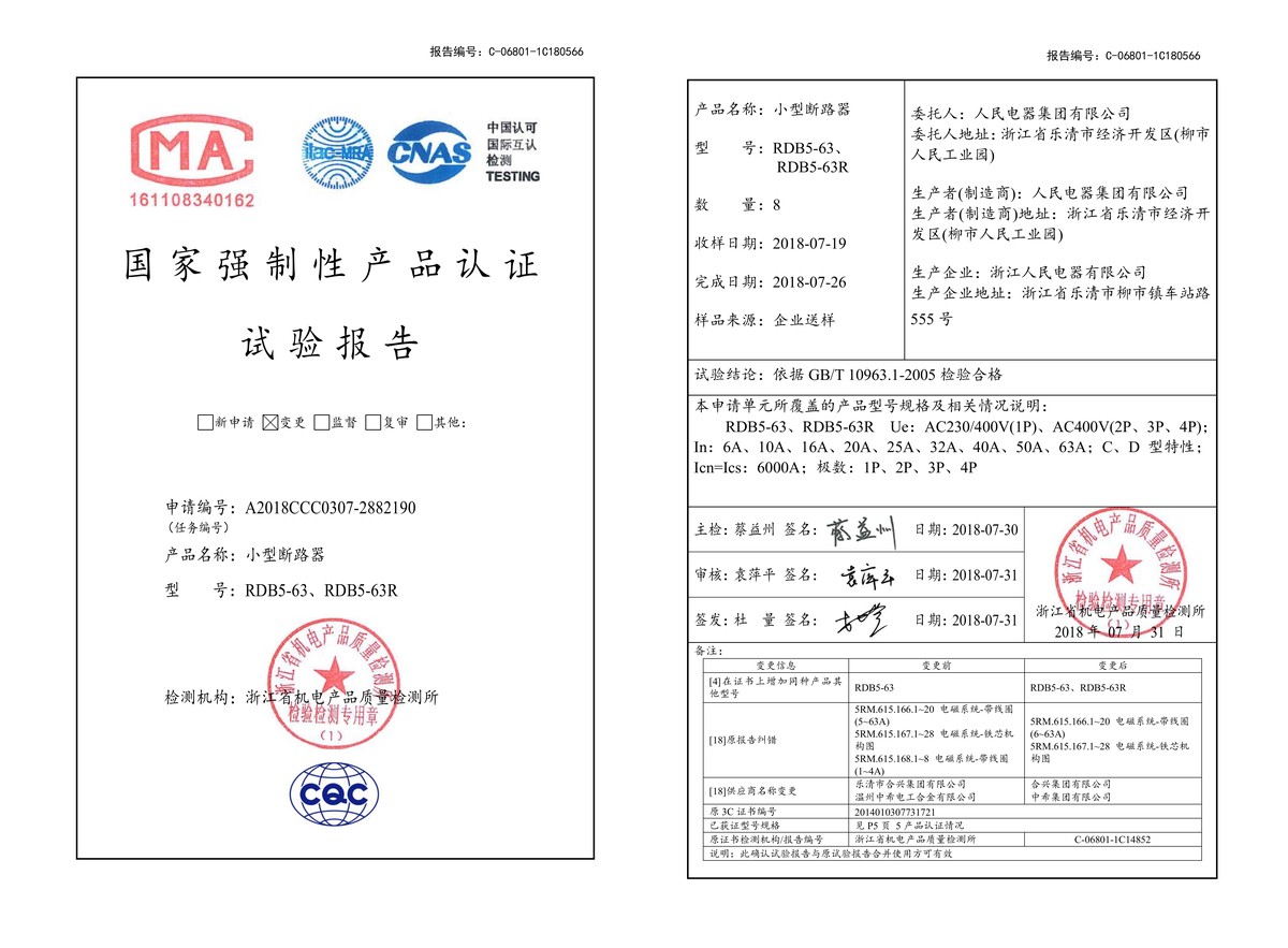 CCC試驗報告(201807):RDB5-63,RDB5-63R小型斷路器(點擊下載)