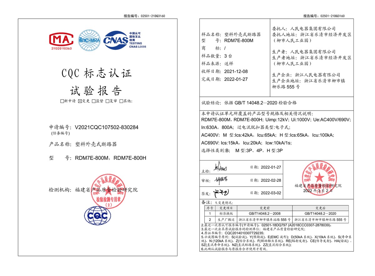 CQC試驗(yàn)報(bào)告(202203):RDM7E-800M,RDM7E-800H塑料外殼式斷路器(點(diǎn)擊下載)