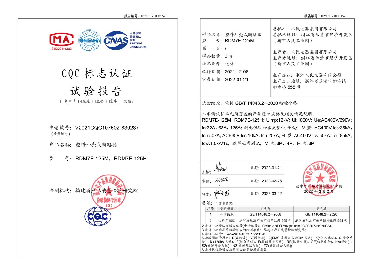 CQC試驗報告(202203):RDM7E-125M,RDM7E-125H塑料外殼式斷路器(點擊下載)