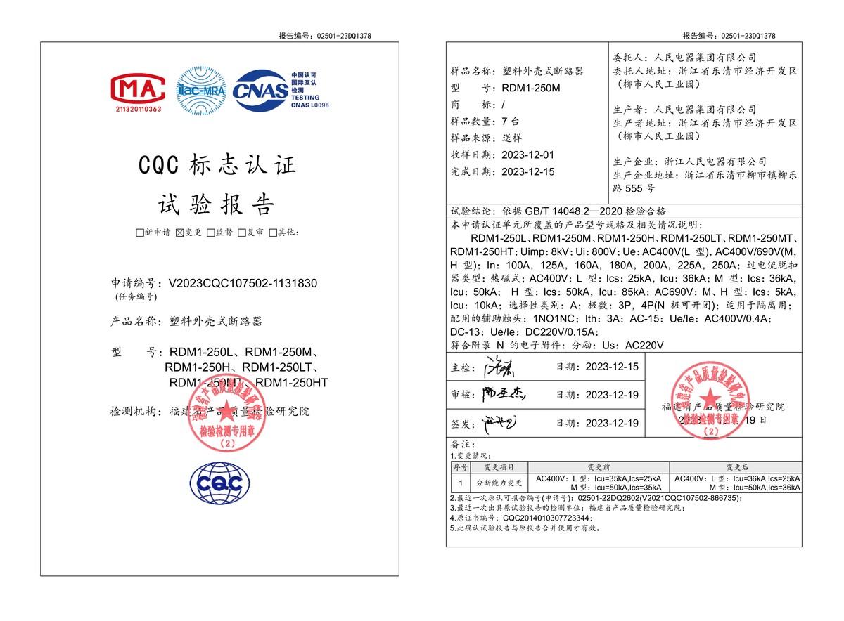 CQC試驗(yàn)報(bào)告(202312):RDM1-250L,RDM1-250M,RDM1-250H,RDM1-250LT,RDM1-250MT,RDM1-250HT塑料外殼式斷路器(點(diǎn)擊下載)