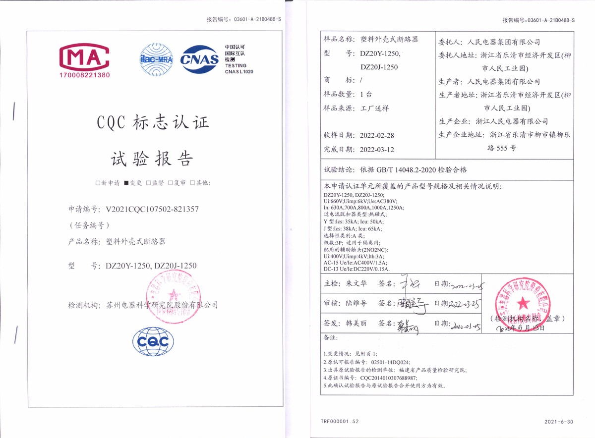 CQC試驗(yàn)報(bào)告(202203):DZ20Y-1250,DZ20J-1250塑料外殼式斷路器(點(diǎn)擊下載)