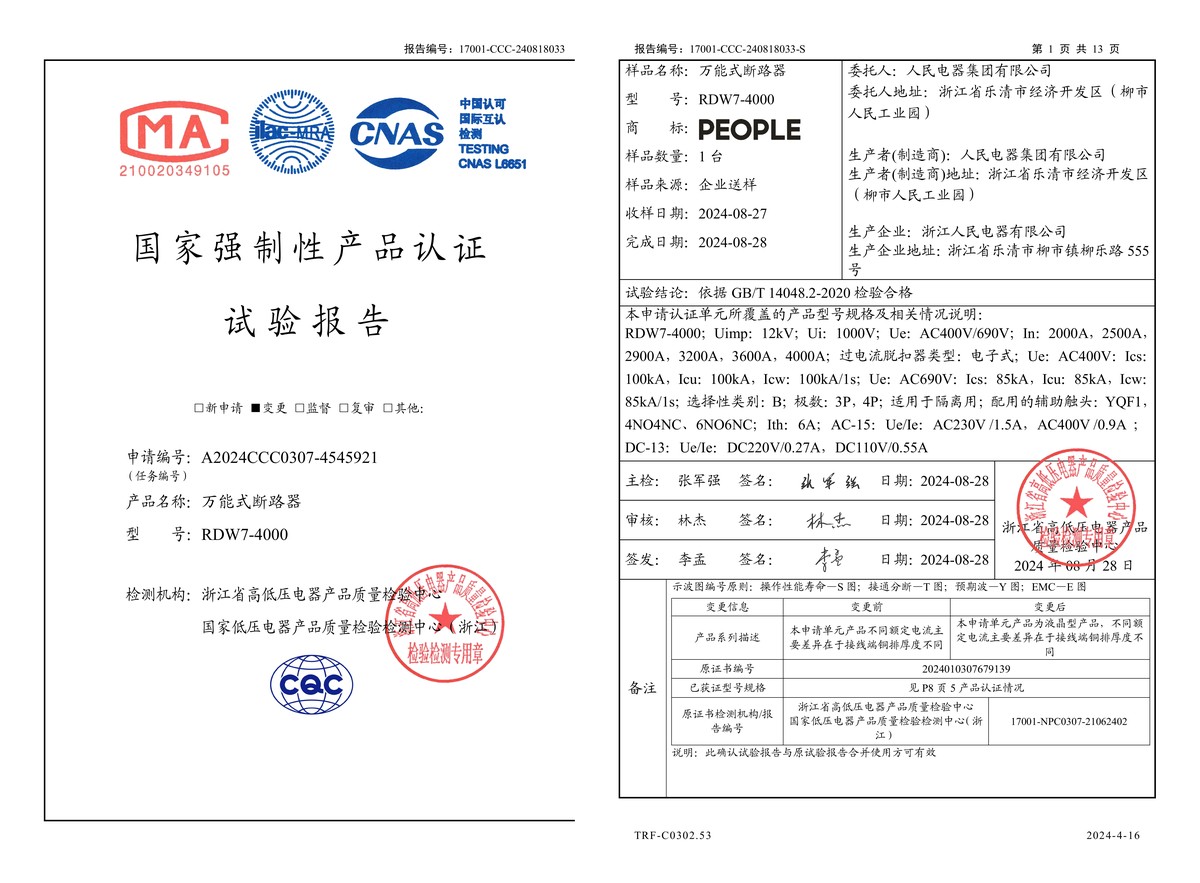 CCC試驗報告(202408):RDW7-4000萬能式斷路器(點擊下載)