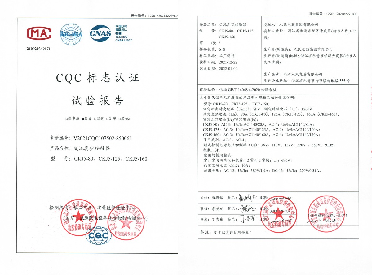 CQC試驗報告(202201):CKJ5-80,CKJ5-125,CKJ5-160交流真空接觸器(點擊下載)