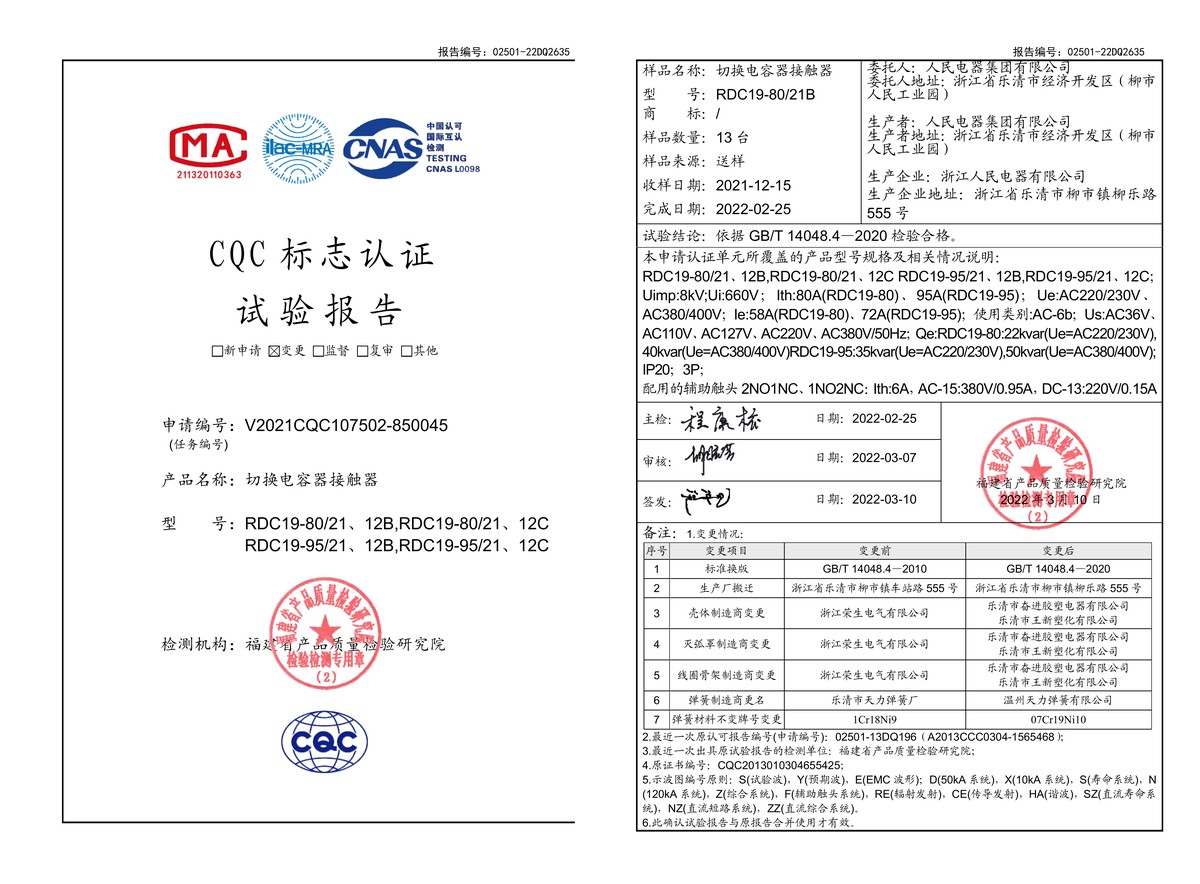 CQC試驗報告(202203):RDC19-80B、RDC19-95B切換電容器接觸器(點擊下載)