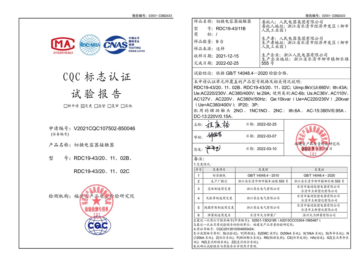 CQC試驗(yàn)報(bào)告(202203):RDC19-43/20B、RDC19-43/11B、RDC19-43/02B/C切換電容器接觸器(點(diǎn)擊下載)