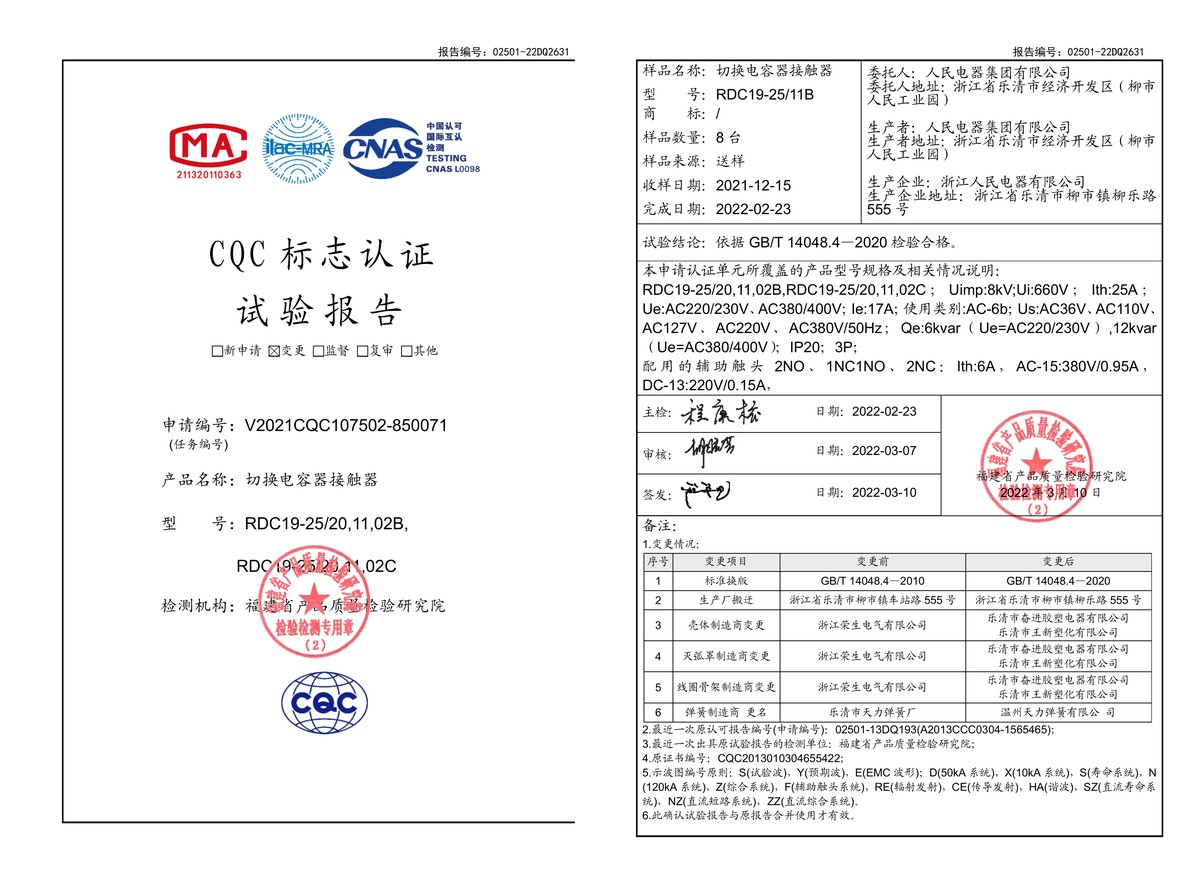 CQC試驗(yàn)報(bào)告(202203):RDC19-25/20B,RDC19-25/02B,RDC19-25/11B切換電容器接觸器(點(diǎn)擊下載)