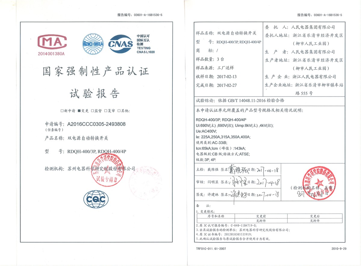 CCC試驗報告(201704):RDQH-400雙電源自動轉(zhuǎn)換開關(guān)(點擊下載)