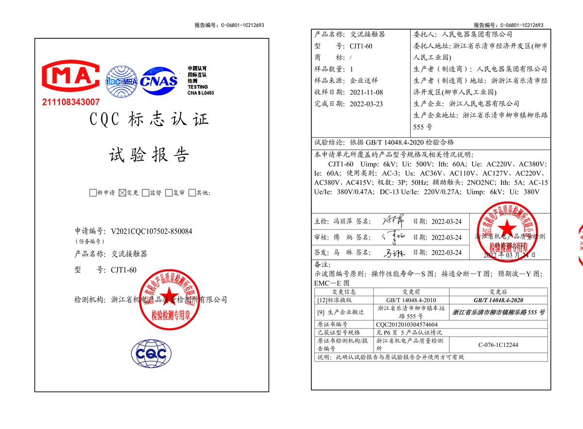 CQC試驗報告(202203):CJT1-60交流接觸器(點擊下載)