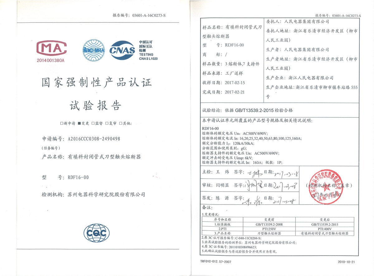 CCC試驗(yàn)報(bào)告(201703):RDF16-00有填料封閉管式刀型觸頭熔斷器(點(diǎn)擊下載)