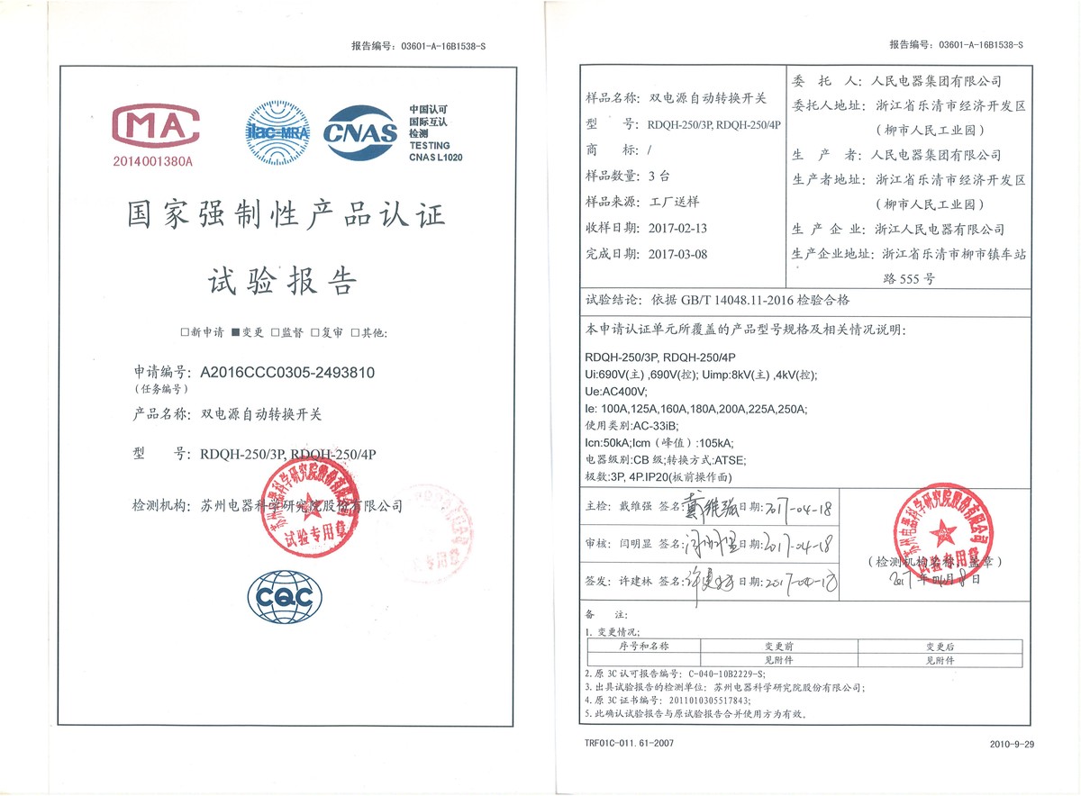 CCC試驗(yàn)報告(201704):RDQH-250雙電源自動轉(zhuǎn)換開關(guān)(點(diǎn)擊下載)