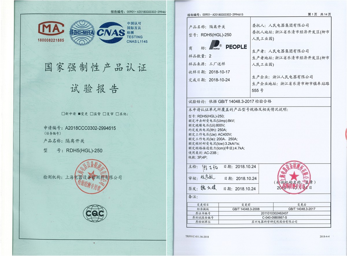 CCC試驗報告(201810):RDH5(HGL)-250隔離開關(guān)(點擊下載)