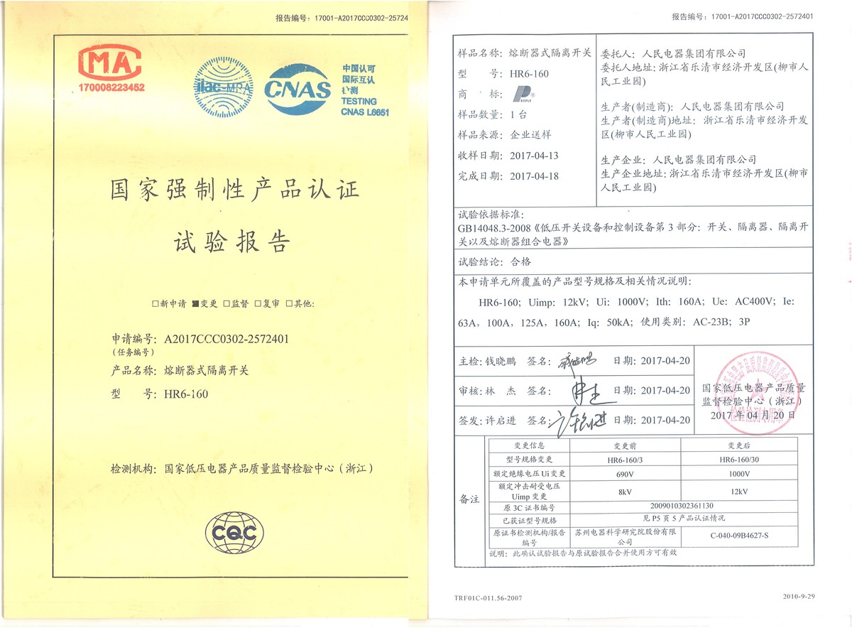 CCC試驗報告(201704):HR6-160熔斷器式隔離開關(點擊下載)