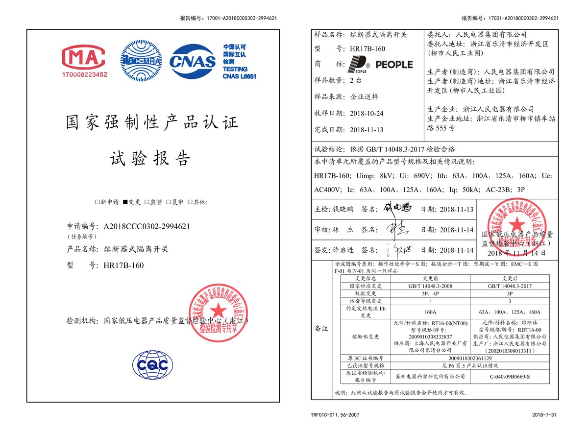 CCC試驗(yàn)報(bào)告(201811):HR17B-160熔斷器式隔離開關(guān)(點(diǎn)擊下載)