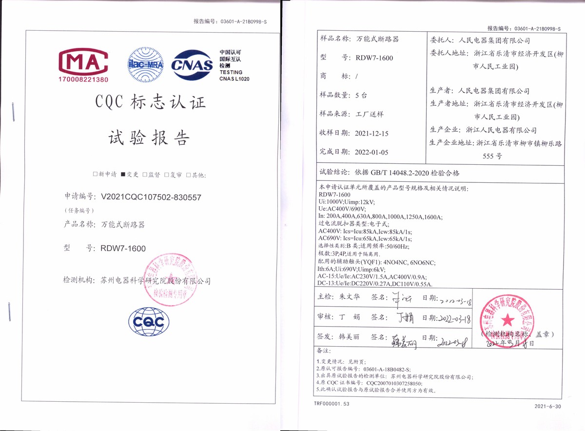 CQC試驗(yàn)報(bào)告(202203):RDW7-1600萬能式斷路器(點(diǎn)擊下載)