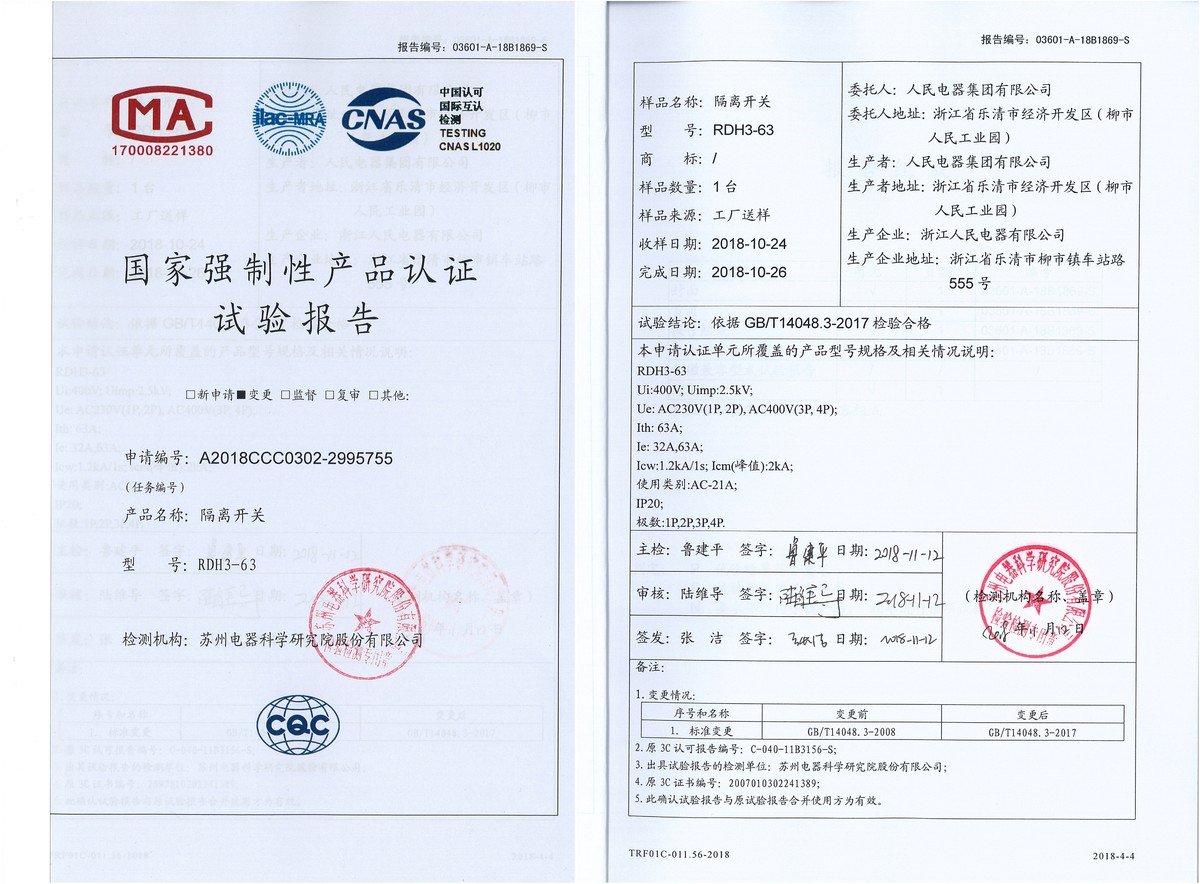 CCC試驗報告(201811):RDH3-63隔離開關(guān)(點擊下載)