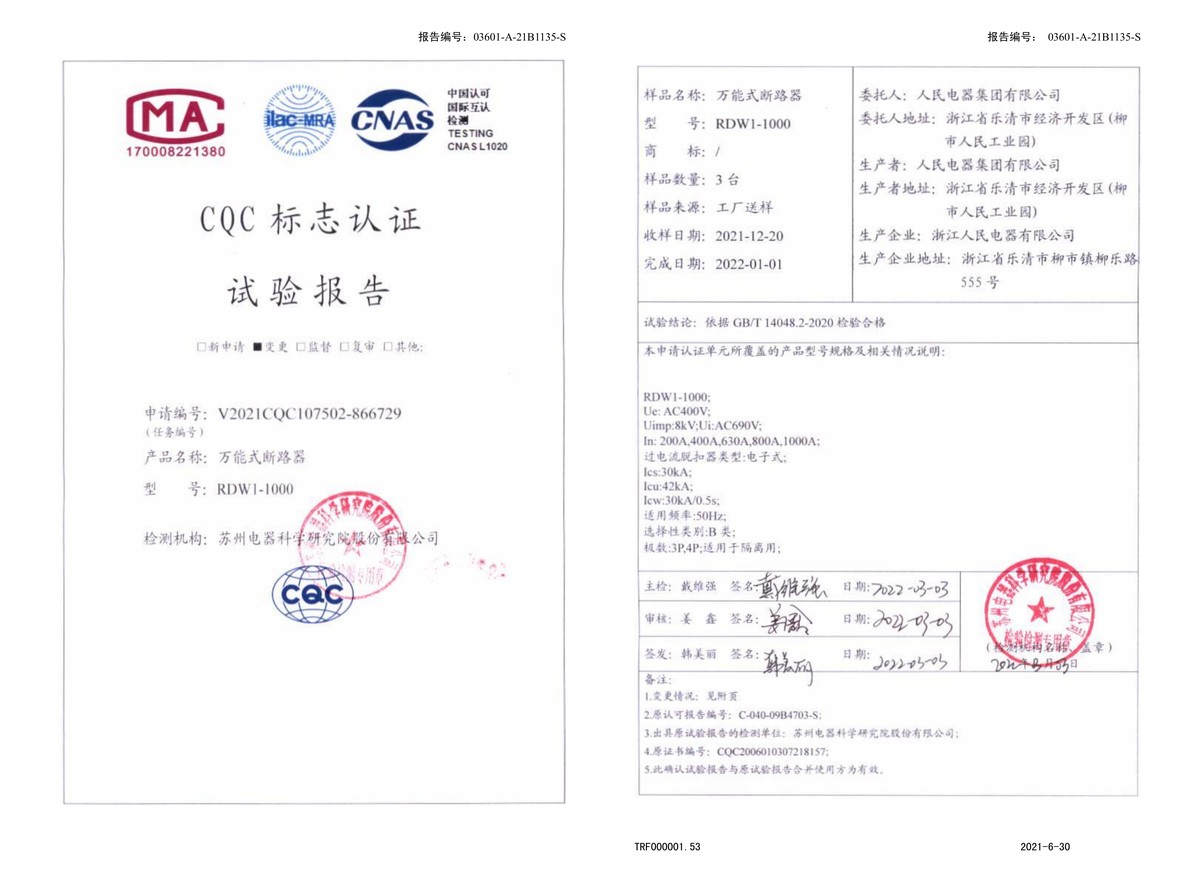 CQC試驗(yàn)報(bào)告(202203):RDW1-1000萬能式斷路器(點(diǎn)擊下載)