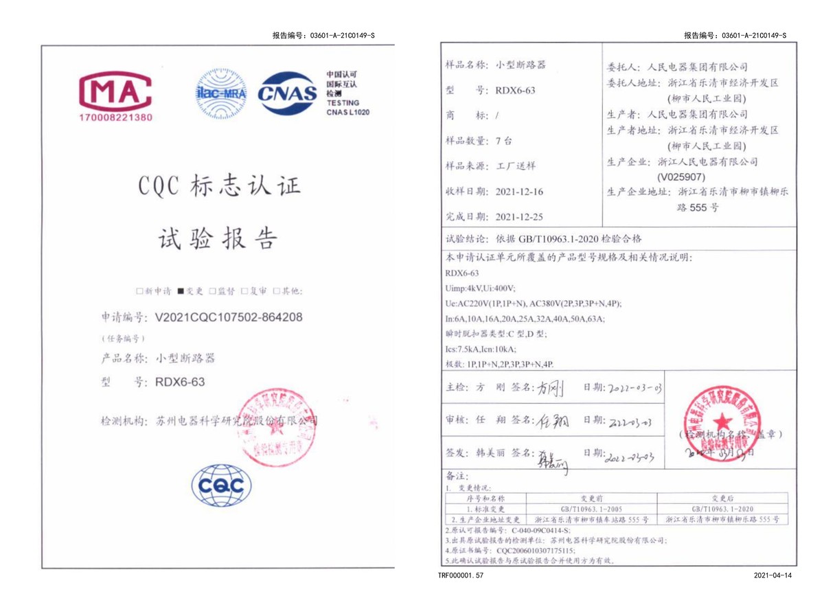 CQC試驗(yàn)報(bào)告(202203):RDX6-63小型斷路器(點(diǎn)擊下載)