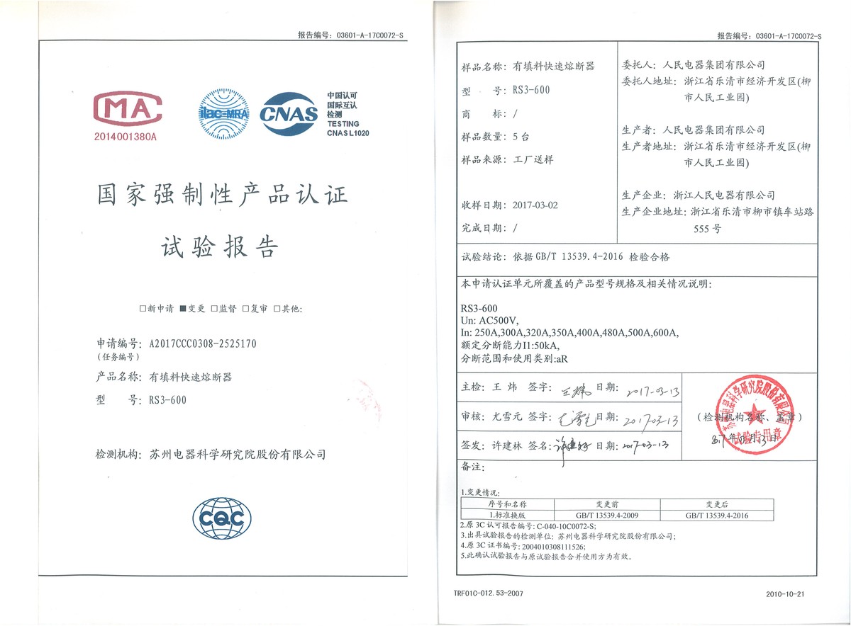 CCC試驗(yàn)報(bào)告(201703):RS3-600有填料快速熔斷器(點(diǎn)擊下載)