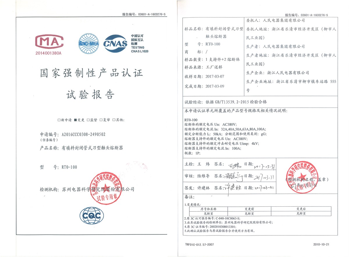CCC試驗(yàn)報(bào)告(201703):RT0-100有填料封閉管式刀型觸頭熔斷器(點(diǎn)擊下載)