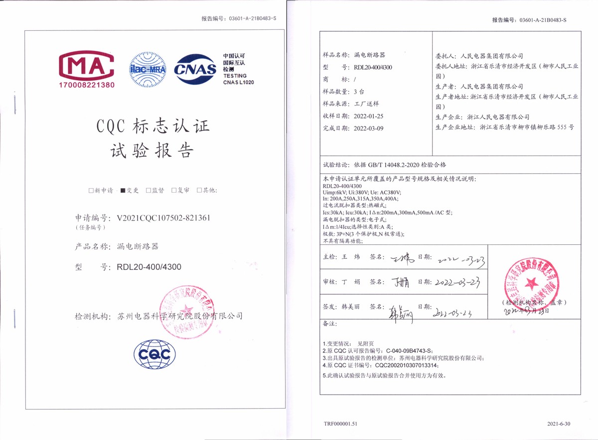CQC試驗報告(202203):RDL20-400/4300漏電斷路器(點擊下載)