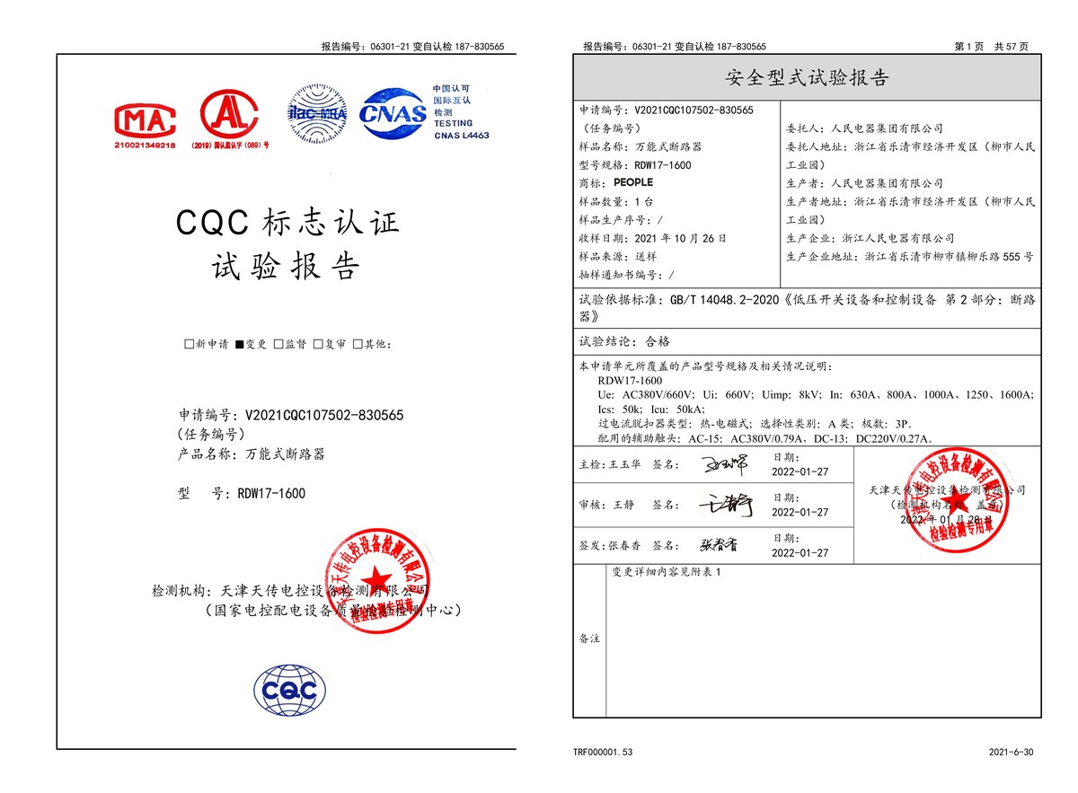 CQC試驗報告(202201):RDW17-1600萬能式斷路器(點擊下載)
