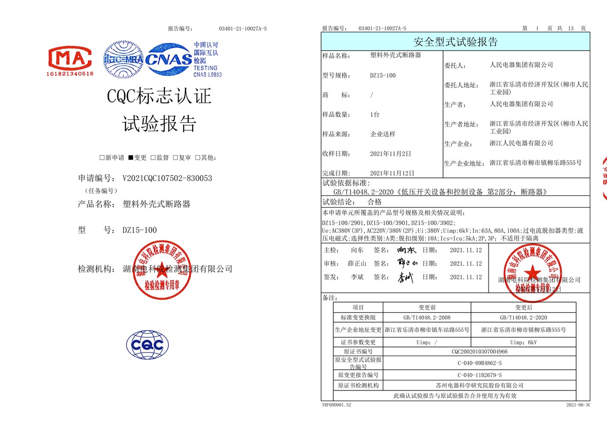 CQC試驗報告(202111):DZ15-100塑料外殼式斷路器(點擊下載)