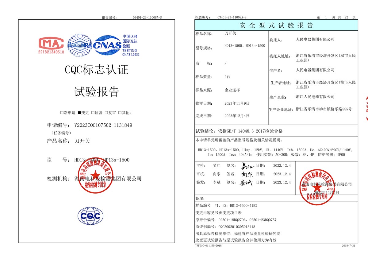 CQC試驗(yàn)報(bào)告(202312):HD13-1500,HD13s-1500刀開(kāi)關(guān)(點(diǎn)擊下載)