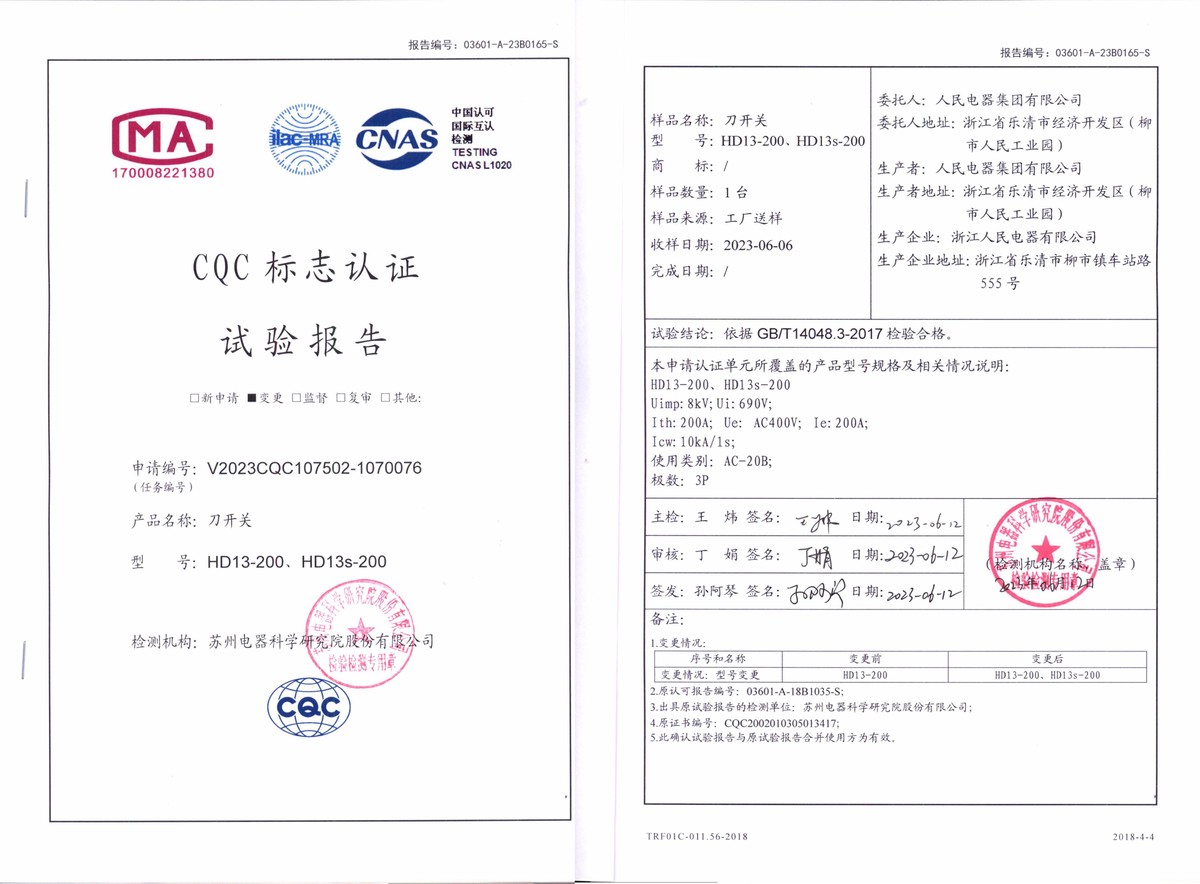 CQC試驗報告(202306):HD13-200,HD13s-200刀開關(guān)(點擊下載)
