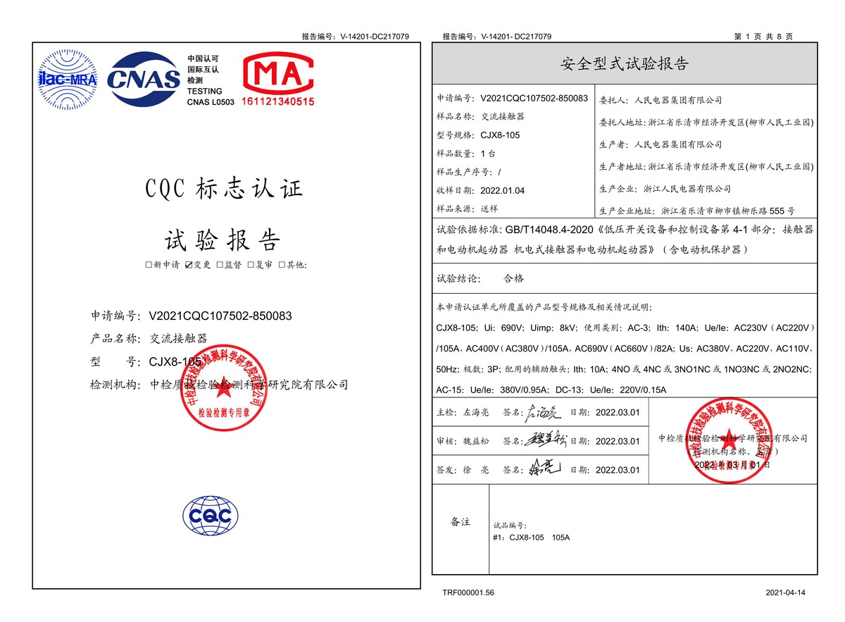 CQC試驗(yàn)報(bào)告(202203):CJX8-105交流接觸器(點(diǎn)擊下載)