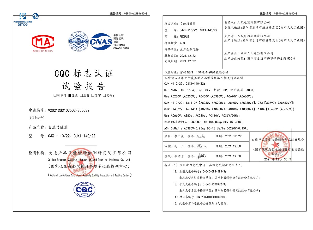 CQC試驗報告(202112):CJX1-110/22,CJX1-140/22交流接觸器(點(diǎn)擊下載)