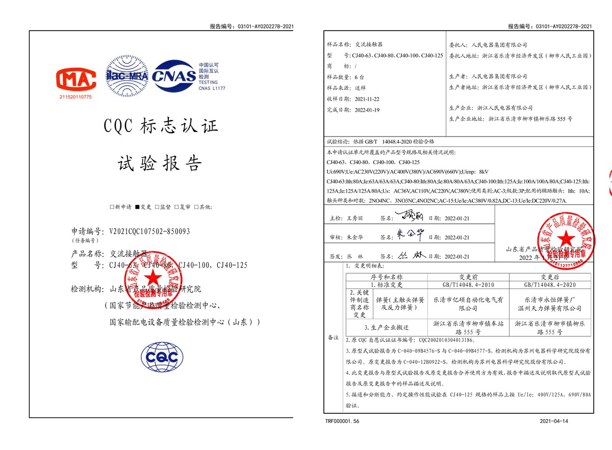 CQC試驗(yàn)報(bào)告(202201):CJ40-63,CJ40-80,CJ40-100,CJ40-125交流接觸器(點(diǎn)擊下載)