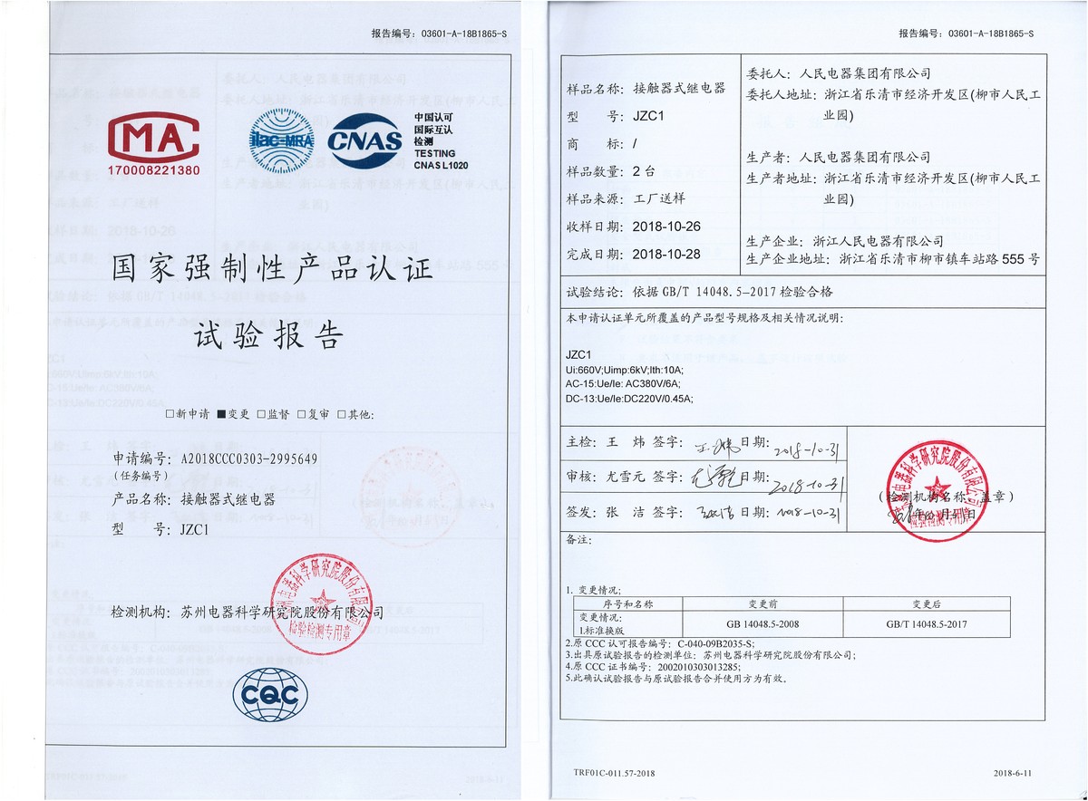 CCC試驗報告(201810):JZC1接觸器式繼電器(點擊下載)