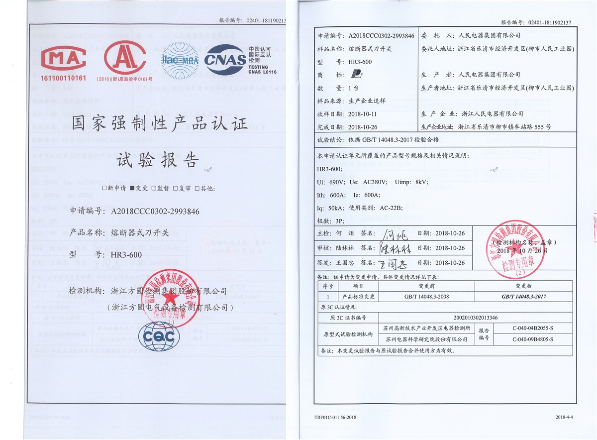 CCC試驗(yàn)報(bào)告(201810):HR3-600熔斷器式刀開(kāi)關(guān)(點(diǎn)擊下載)