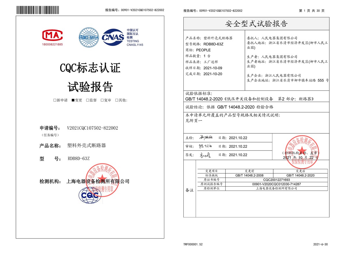 CQC試驗(yàn)報(bào)告(202110):RDB8D-63Z塑料外殼式斷路器(點(diǎn)擊下載)