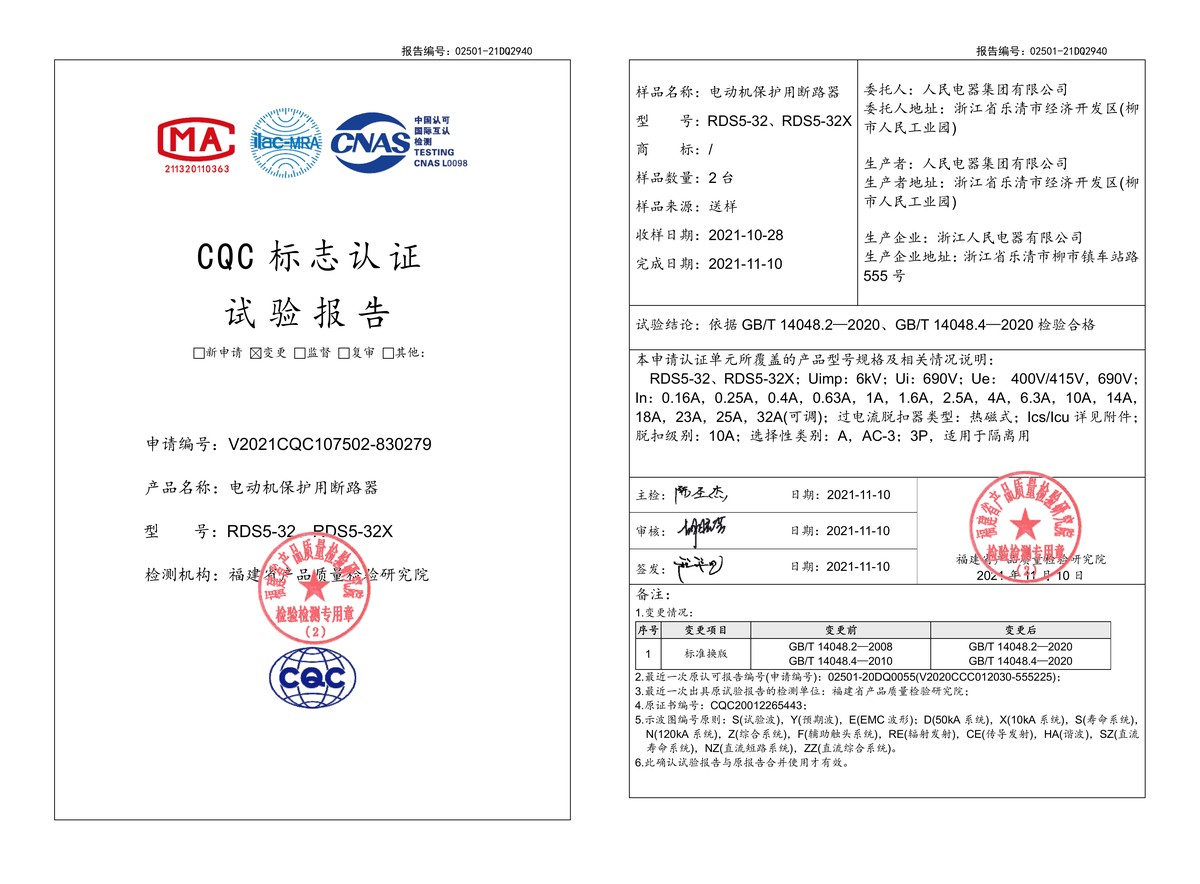 CQC試驗報告(202111):RDS5-32,RDS5-32X電動機保護用斷路器(點擊下載)