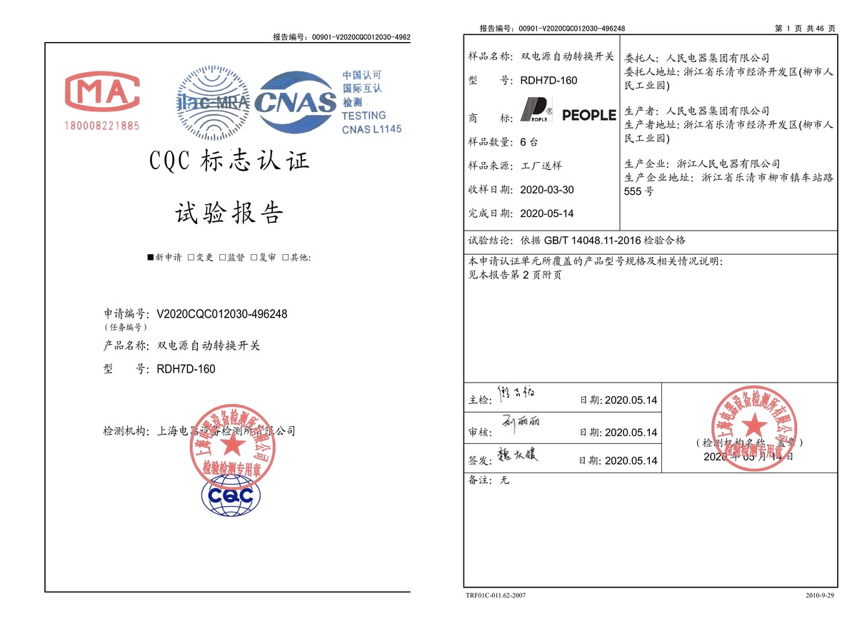 CQC試驗(yàn)報(bào)告(202005):RDH7D-160雙電源自動(dòng)轉(zhuǎn)換開關(guān)(點(diǎn)擊下載)