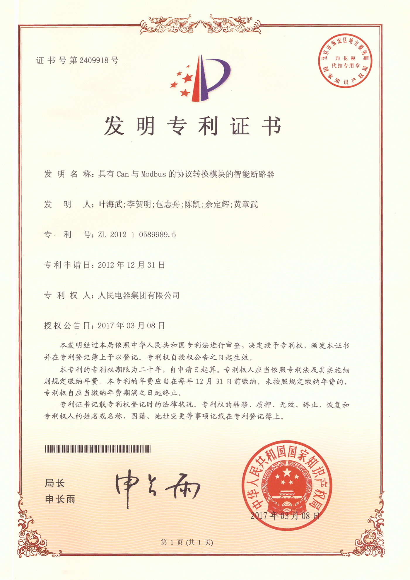 發(fā)明專利證書:具有Can與Modbus的協(xié)議轉(zhuǎn)換模塊和智能斷路器(點(diǎn)擊下載)