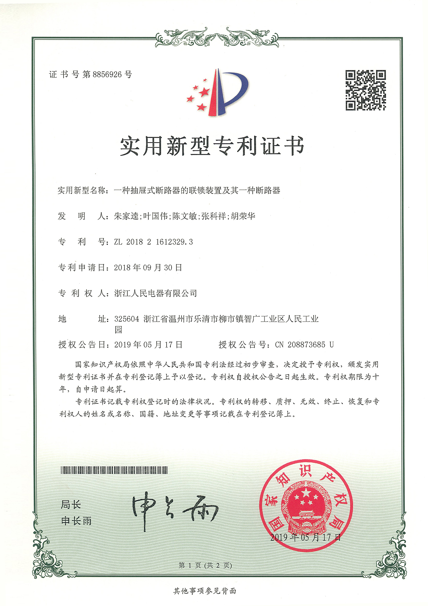 實(shí)用新型專利證書(shū):一種抽屜式斷路器的聯(lián)鎖裝置及其一種斷路器(點(diǎn)擊下載)