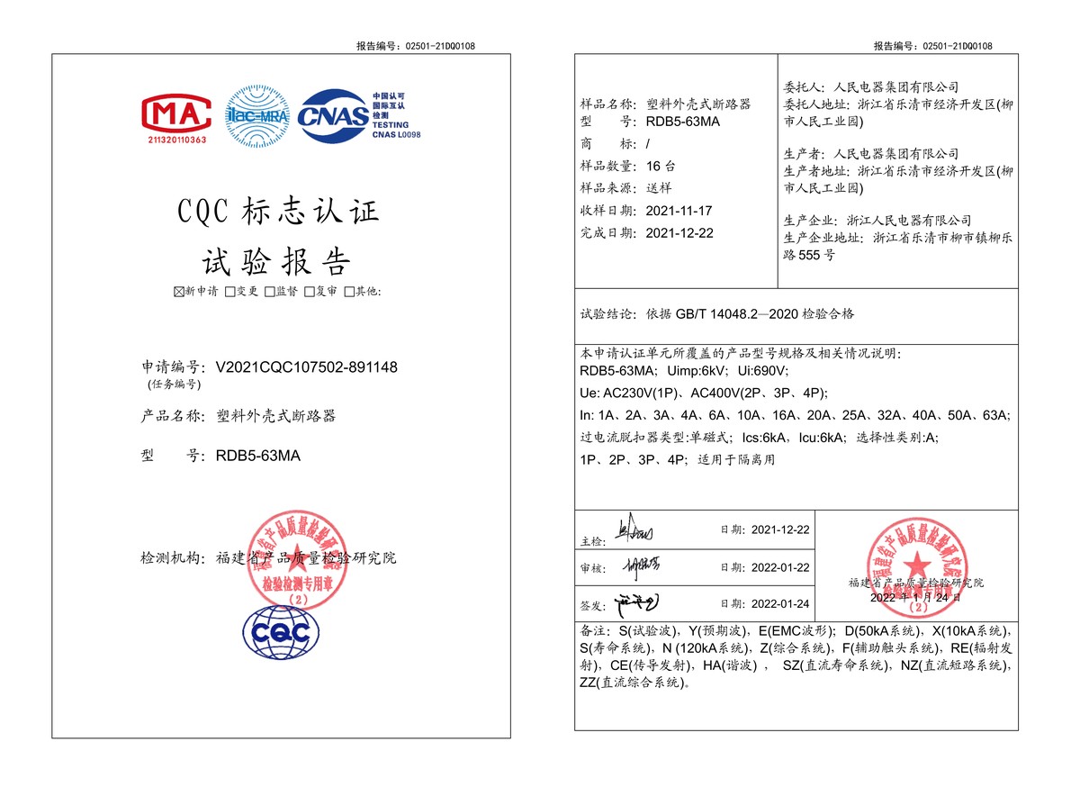 CQC試驗(yàn)報(bào)告(202112):RDB5-63MA塑料外殼式斷路器(點(diǎn)擊下載)
