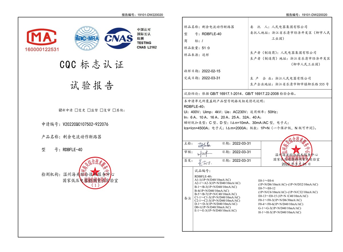 CQC試驗(yàn)報(bào)告(202203):RDBFLE-40剩余電流動(dòng)作斷路器(點(diǎn)擊下載)