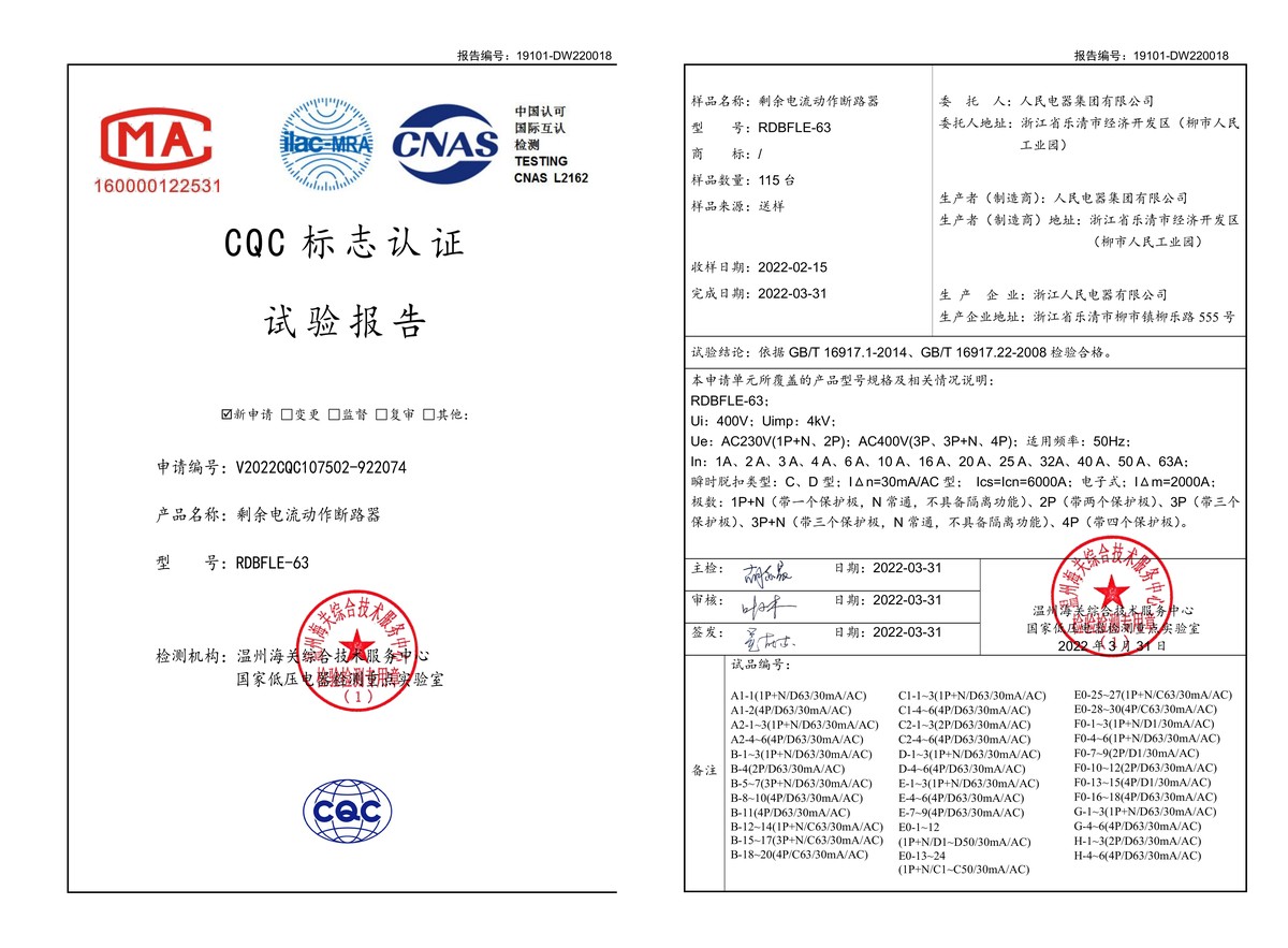 CQC試驗報告(202203):RDBFLE-63剩余電流動作斷路器(點擊下載)